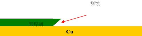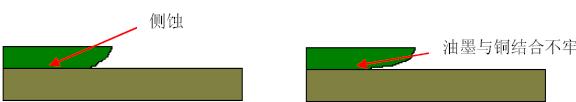 而對(duì)于局部由于縫隙導(dǎo)致的離子供應(yīng)不足的問(wèn)題,筆者認(rèn)為綠油工藝中可能有兩個(gè)因素影響較大:一個(gè)因素是油墨的側(cè)蝕;另外的一個(gè)因素可能是油墨與銅層之間的結(jié)合力。對(duì)此可用下圖加以說(shuō)明: