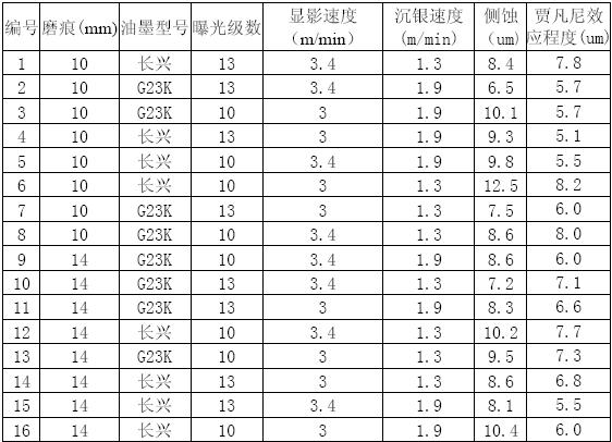 不同的油墨有不同的參數(shù)要求,筆者建議若采用化學(xué)銀工藝,不同油墨應(yīng)對(duì)其不同參數(shù)下的側(cè)蝕進(jìn)行比較。選擇側(cè)蝕較優(yōu)的參數(shù)加工。