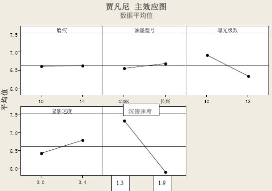 從主效應(yīng)圖中可以看出,在試驗(yàn)的5個(gè)因素中,沉銀速度是影響賈凡尼效應(yīng)關(guān)鍵的因素,曝光級(jí)數(shù)也對(duì)賈凡尼效應(yīng)有較大的影響,顯影速度、油墨型號(hào)和磨痕對(duì)賈凡尼效應(yīng)沒(méi)有顯著的影響。